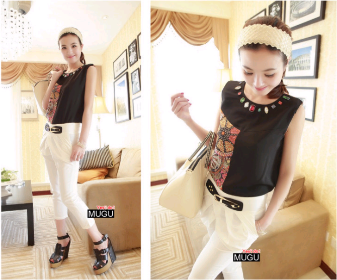 เสื้อแขนกุด ปักเพชรที่คอ มี สีดำกับสีขาว